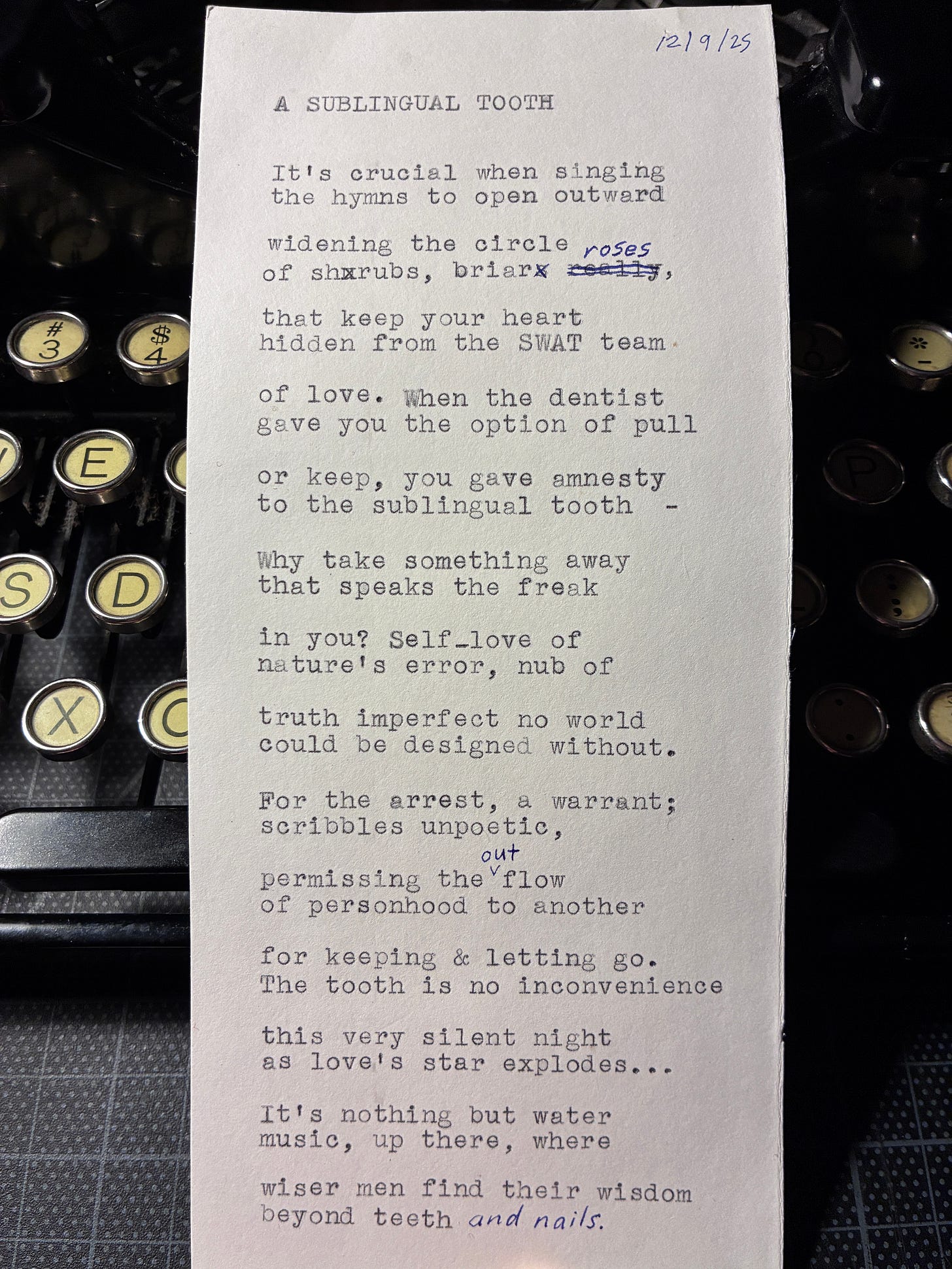 It's crucial when singing the hymns to open outward widening the circle of shrubs, briar roses, that keep your heart hidden from the SWAT team of love. When the dentist gave you the option to pull or keep, you gave amnesty to the sublingual tooth - why take something away that speaks the freak in you? Self_love of nature's error, nub of truth imperfect no world could be designed without. For the arrest, a warrant; scribbles unpoetic, permission the outflow of personhood to another for keeping and letting go. The tooth is no inconvenience this very silent night as love's star explodes... it's nothing but water music, up there, where wiser men find their wisdom beyond teeth or nails.